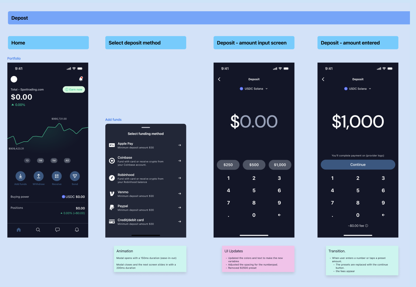 I led Spot from internal beta to launch. I fixed wobbly flows, cleaned up an off-the-shelf design system so it matched the real product, and worked closely with PM and engineering. Big wins: a slippage control that cut failed trades from 72% → 26%, a faster confirmation step (trade time ↓ ~36%, completion ↑ ~18pp), and a 16-week React Native rebuild that brought Android to parity using shared logic and simple tokens.