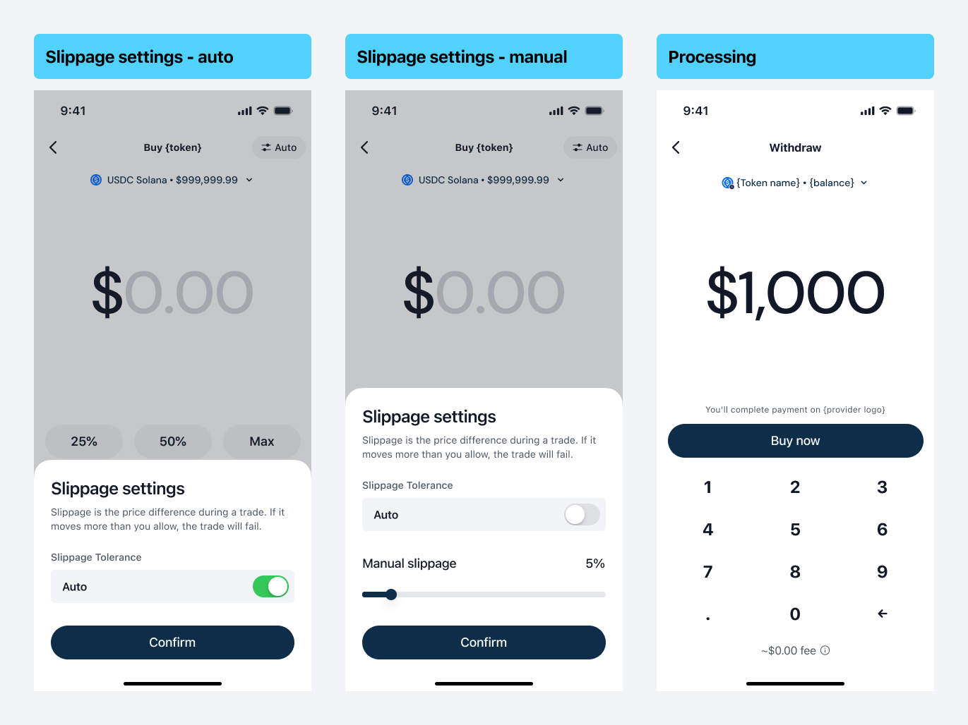 - Slippage control: smart defaults that adjust to market swings, with an option to set it yourself.